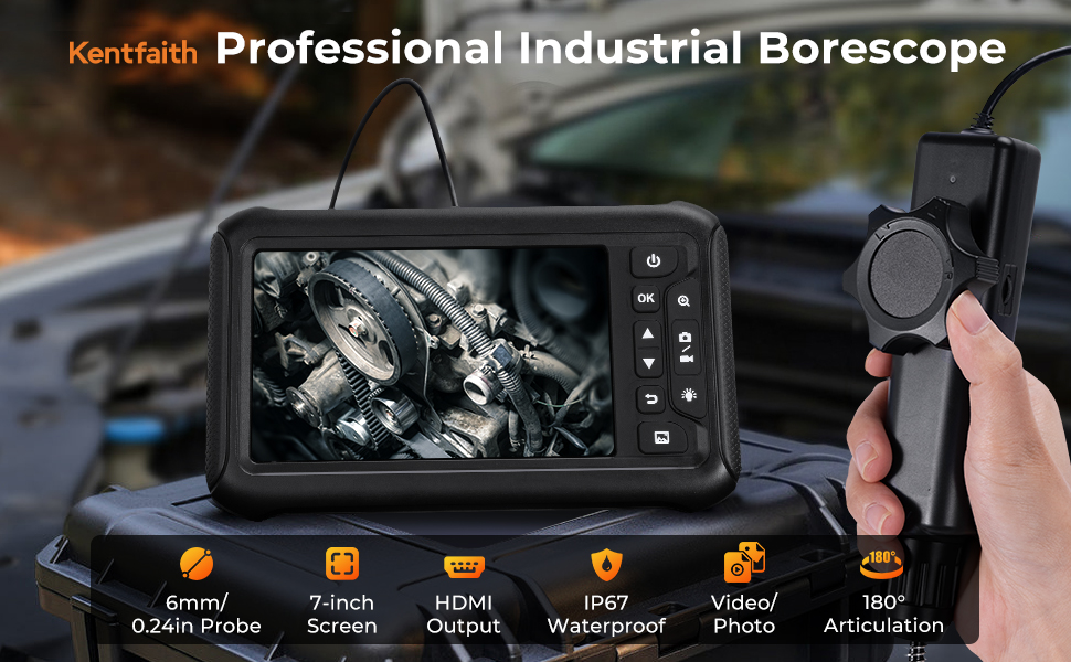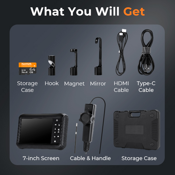 6mm كاميرا تفتيش، مع مفصلات ثنائية الاتجاه 180°، خرج HDMI، شاشة 7 بوصة، بطارية 8000 مللي أمبير في الساعة، فيديو وصور بدقة 1080 بكسل، Kentfaith