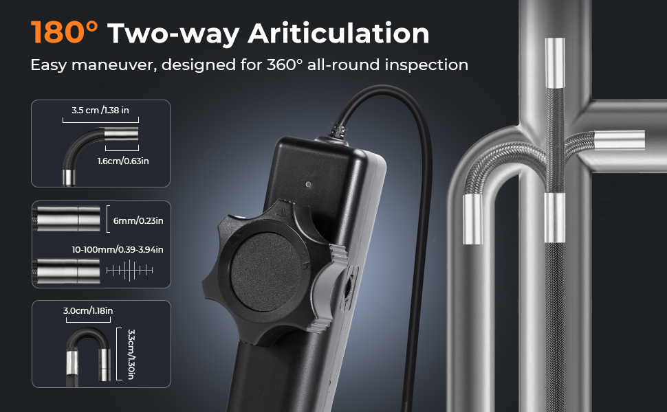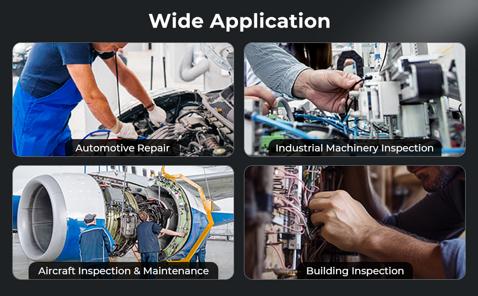 - هذه الكاميرا التفتيشية مثالية لمحترفي إصلاح السيارات، ومهندسي الفضاء والتصنيع، وأخصائيي الصيانة الصناعية، وفنيي إصلاح الإلكترونيات، حيث توفر فحصًا دقيقًا في المساحات التي يصعب الوصول إليها.