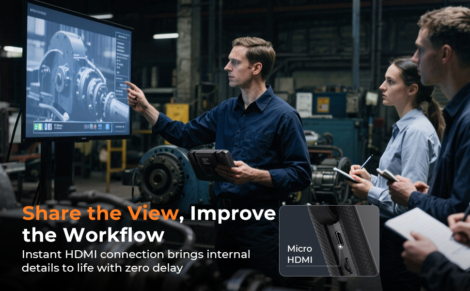 - * إخراج HDMI للتعاون بين الفرق: عرض اللقطات في الوقت الفعلي على شاشة كبيرة باستخدام كابل HDMI المرفق، مما يسمح لعدة أشخاص بمشاهدتها وتحليلها في نفس الوقت. مثالي لصيانة المعدات، وجلسات التدريب، وعروض العملاء، والبحث والتطوير، وفحوصات الجودة في المصنع. بالإضافة إلى ذلك، يتيح لك كابل المسبار القابل للإزالة التبديل بين أقطار أو أطوال مختلفة لتتناسب مع سيناريوهات متنوعة.