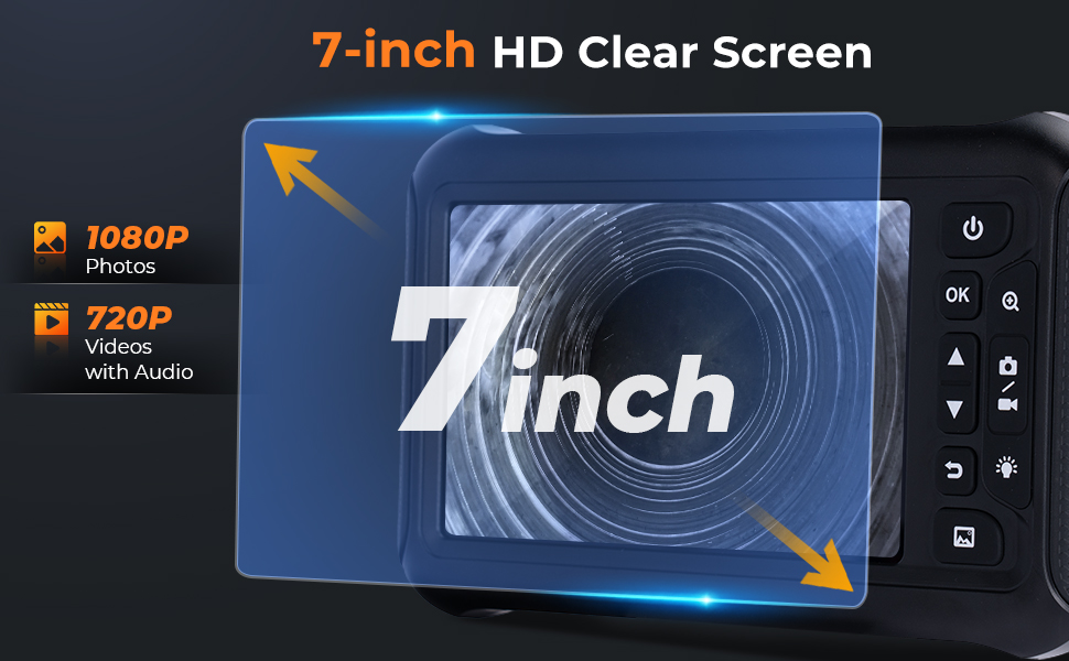 - * شاشة IPS مقاس 7 بوصات وتقنية التقاط بدقة 1080P: مزودة بشاشة IPS عالية الدقة مقاس 7 بوصات بزاوية رؤية واسعة تبلغ 88 درجة، توفر هذه الكاميرا التفتيشية صورًا واضحة ودقيقة لعمليات التفتيش الشاملة. يمكنك التقاط صور ومقاطع فيديو بدقة 1080P بضغطة زر وتخزينها على بطاقة الذاكرة المضمنة سعة 64 جيجابايت. قم بالتكبير حتى 10× لضمان عدم تفويت أي عطل حرك أو شق أو انسداد أثناء التفتيش.
