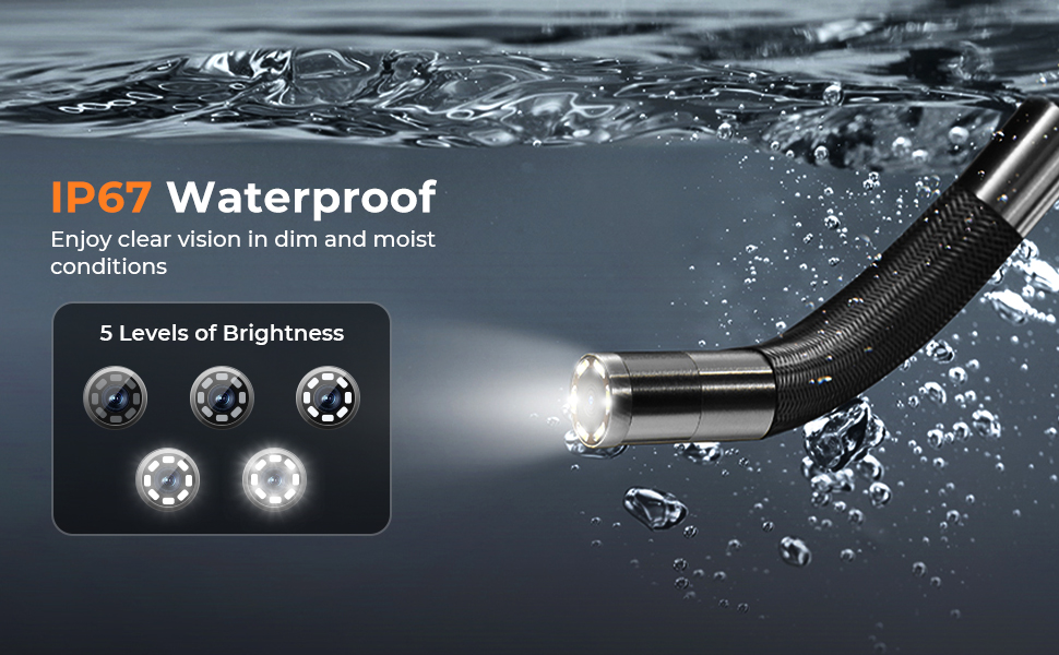 مصمم للعمل الميداني، يتمتع المسبار والكابل بتصنيف IP67، مما يجعلهما مقاومين تمامًا للماء والزيت والغبار. مع 5 مستويات من السطوع، يمكنك فحص الخطوط المملوءة بالسوائل أو البيئات المتسخة بثقة دون خطر التلف.