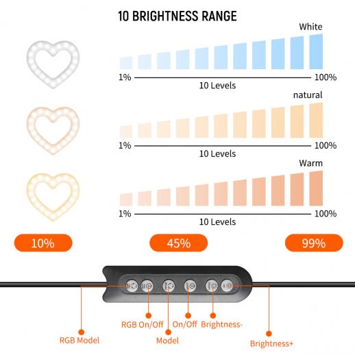 - * Sturdy tripod - Equipped with a desktop tripod, the ring light mounted on the tripod can easily adjust the color and brightness through the control switch to meet your different lighting needs;