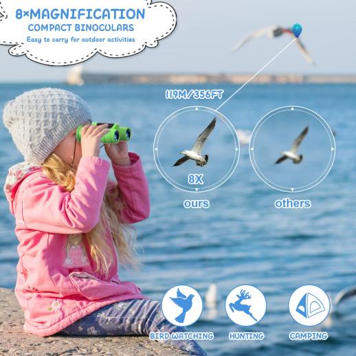 - * توفر البصريات عالية الجودة مع تكبير 8x ونظام منشور السقف صورًا ساطعة وحادة ونقية تمامًا. الأفضل لمشاهدة الطيور ، مناظير الأطفال الحقيقية للأولاد والبنات ؛