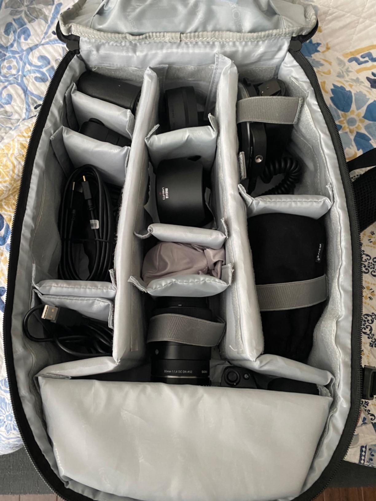 حقيبة رائعة، استخدمتها في رحلتي الأخيرة على الطريق إلى نيوبورت بولاية رود آيلاند. تمكنت من تنظيم الجزء الداخلي من الحقيبة بناءً على كيفية رغبتي في وضع أغراضي فيها. تناسب كاميرا Sony A6000 بشكل مثالي مع عدستين إضافيتين. تمكنت من حمل حامل ثلاثي القوائم الكبير على الجانب. بالنسبة لأي شخص مهتم بالتصوير الفوتوغرافي، فأنت تعلم مدى صعوبة حمل كل ذلك في حقيبة واحدة. كما جاءت مع غطاء مقاوم للماء وهو مثالي لأنه هطل المطر في أحد الأيام. كما تحتوي على مساحة كافية لتناسب جميع ملحقات الكاميرا الخاصة بي.